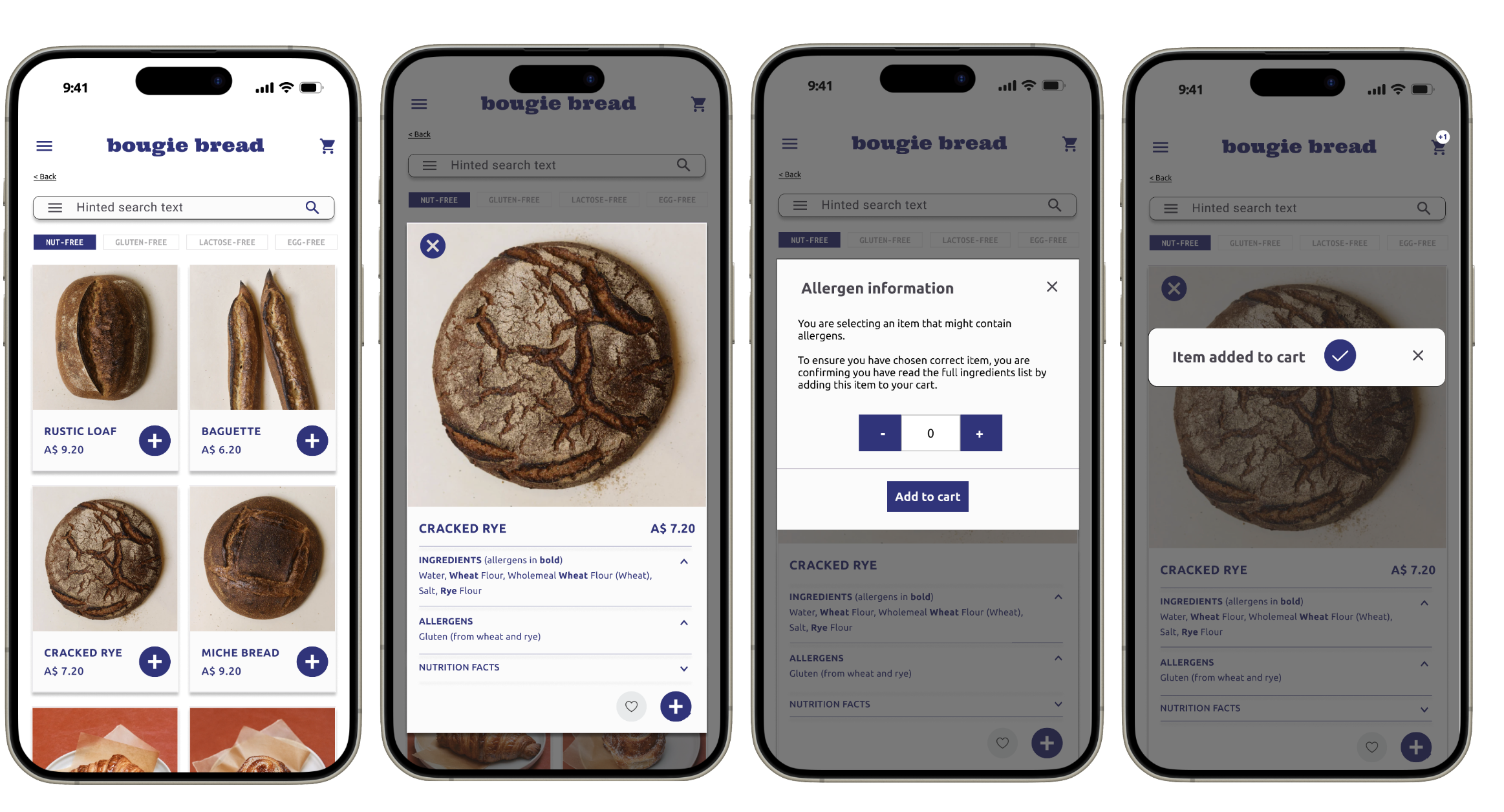 The web and mobile app is designed to facilitate safe and convenient ordering for users, tailored to cater customer’s needs, particularly those with allergies. The products primary aim is to ensure a safer and more accessible order experience from the bakery.