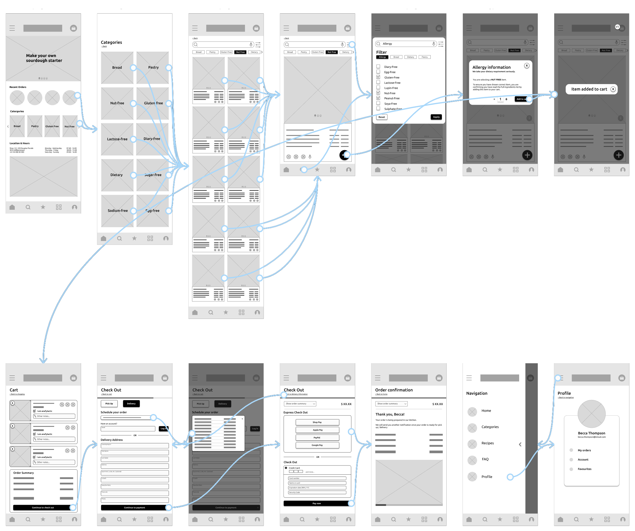 I created the low-fidelity prototype by linking all the screens needed for the main user flow of adding a product to the cart, while at the same time ensuring and empowering the user that they have chosen a suitable product for their needs, prior to completing the checkout process.