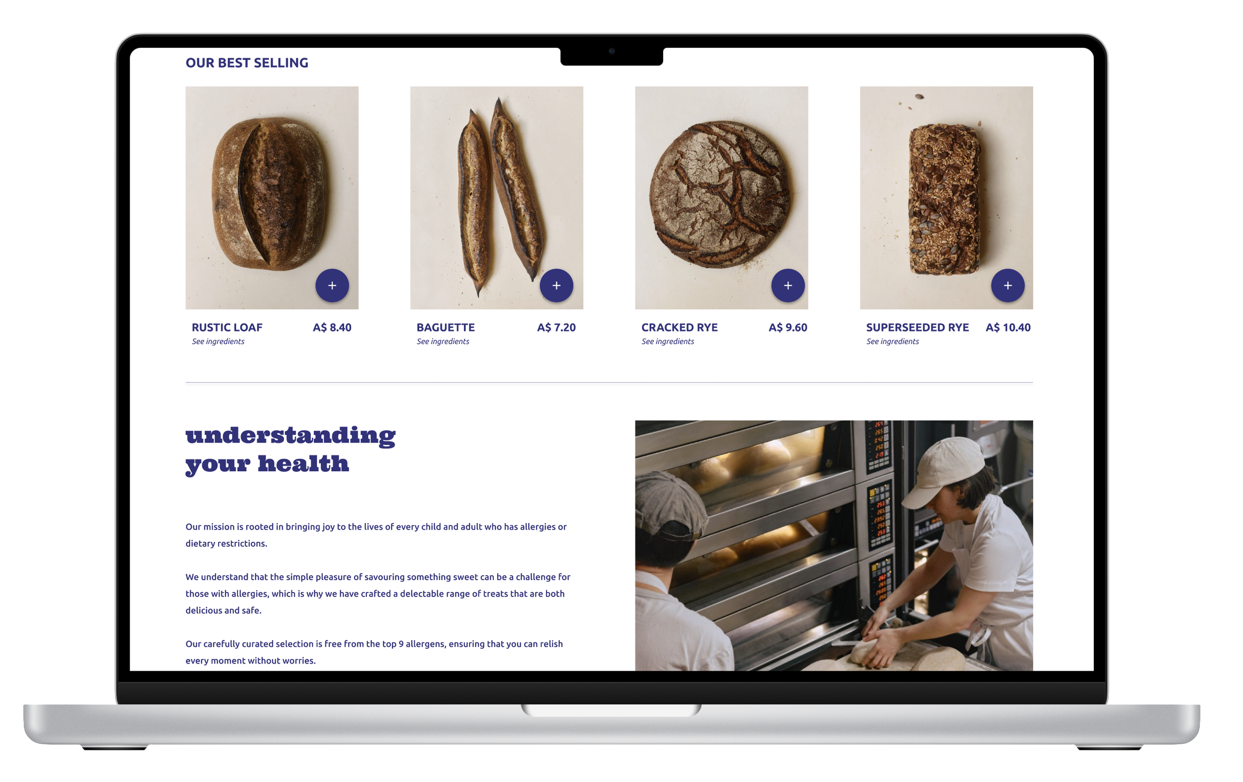 The web and mobile app is designed to facilitate safe and convenient ordering for users, tailored to cater customer’s needs, particularly those with allergies. The products primary aim is to ensure a safer and more accessible order experience from the bakery.