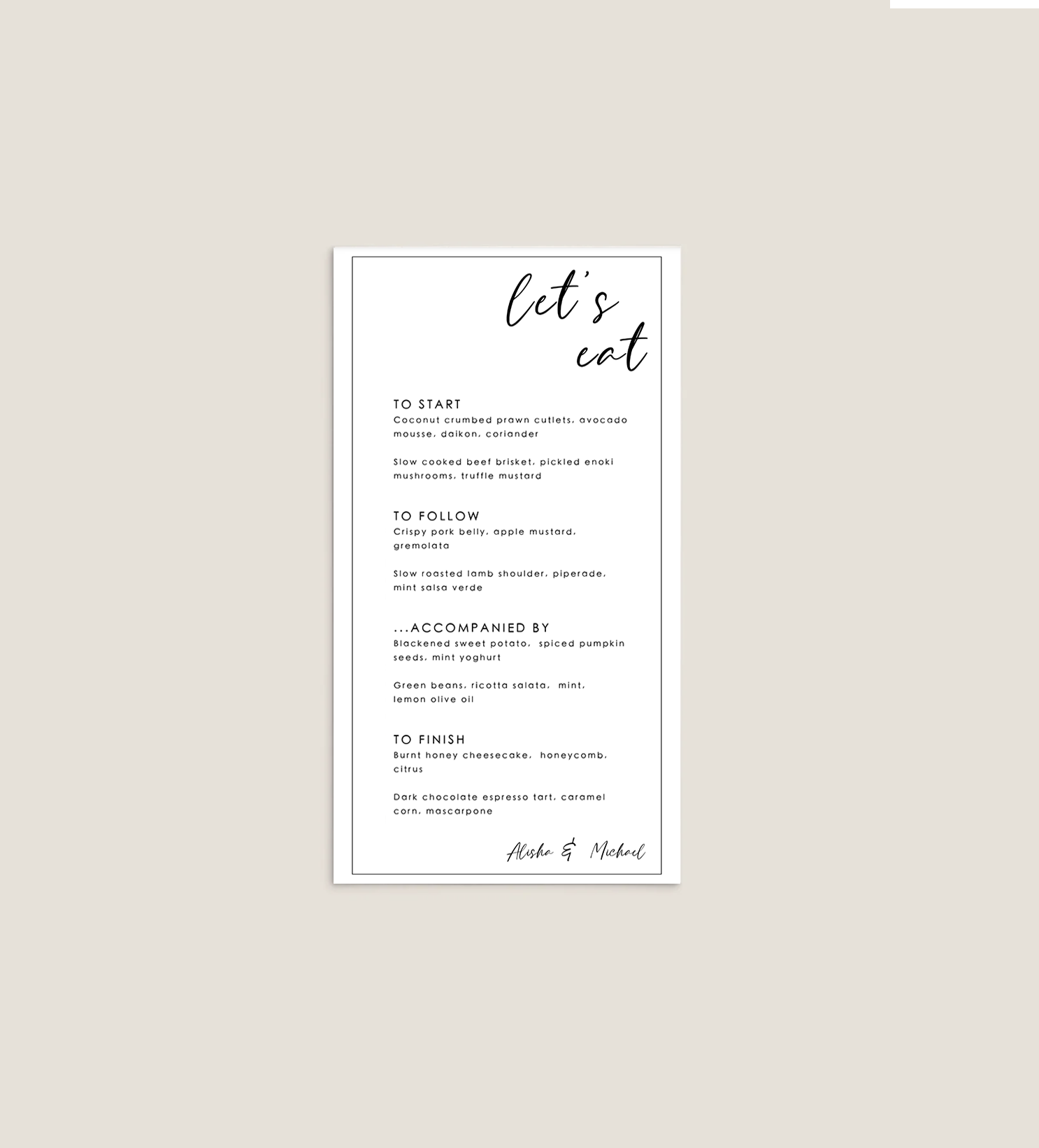 Discover my semi-custom collections, designed to be easily adapted to fit your aesthetic vision and style for every stage of your wedding. From save-the-dates and invitations to day-of stationery, signage, thank-you cards, and personal stationery, I've got you covered.